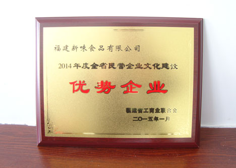熱烈祝賀“福建新味食品有限公司”被福建省工商業(yè)聯(lián)合會(huì)評(píng)為“2014年度全省民營企業(yè)文化建設(shè)優(yōu)勢企業(yè)”稱號(hào)。